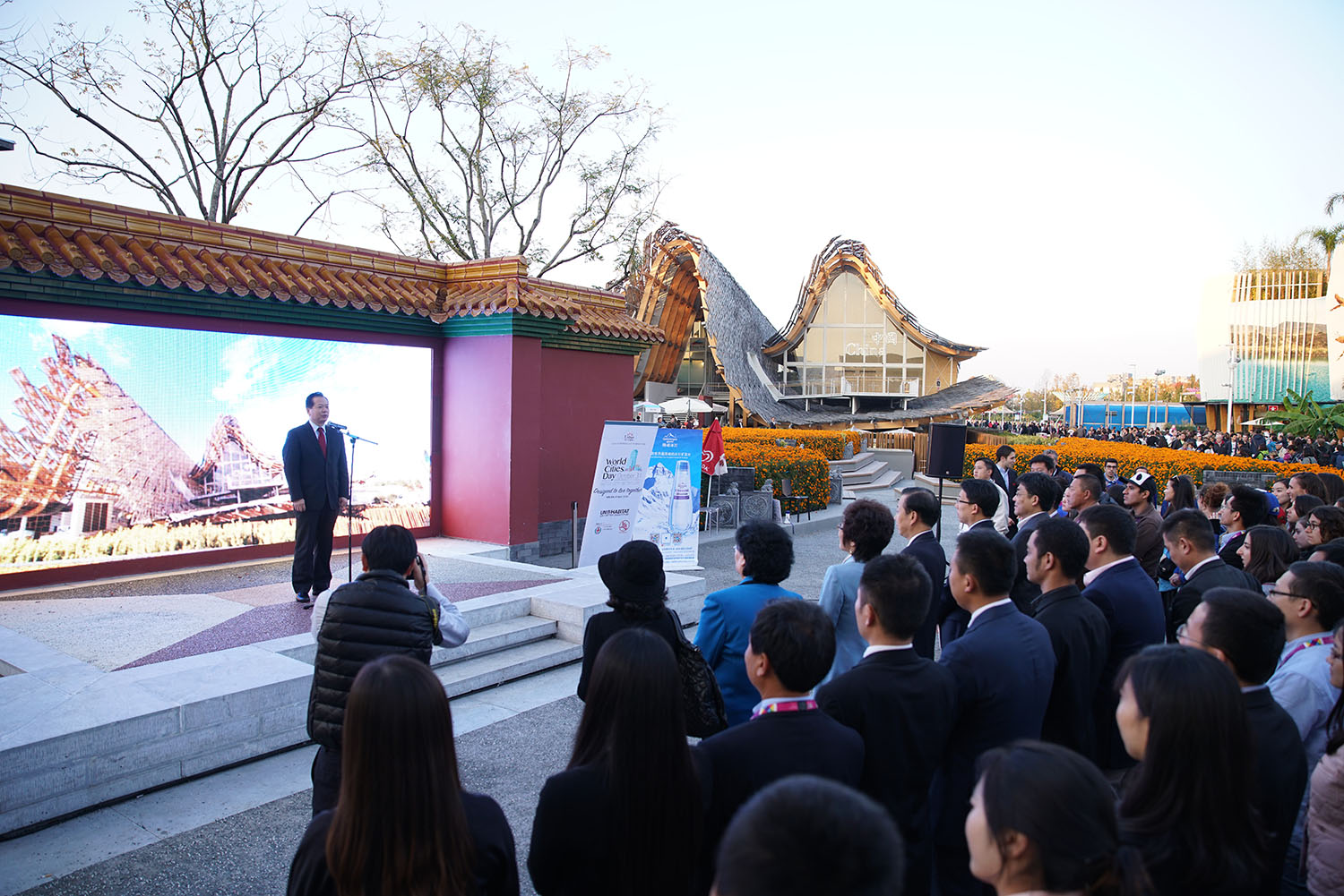 致辞结束后,李瑞宇大使、王锦珍副会长、王冬总领事与中国馆工作人员合影留念。